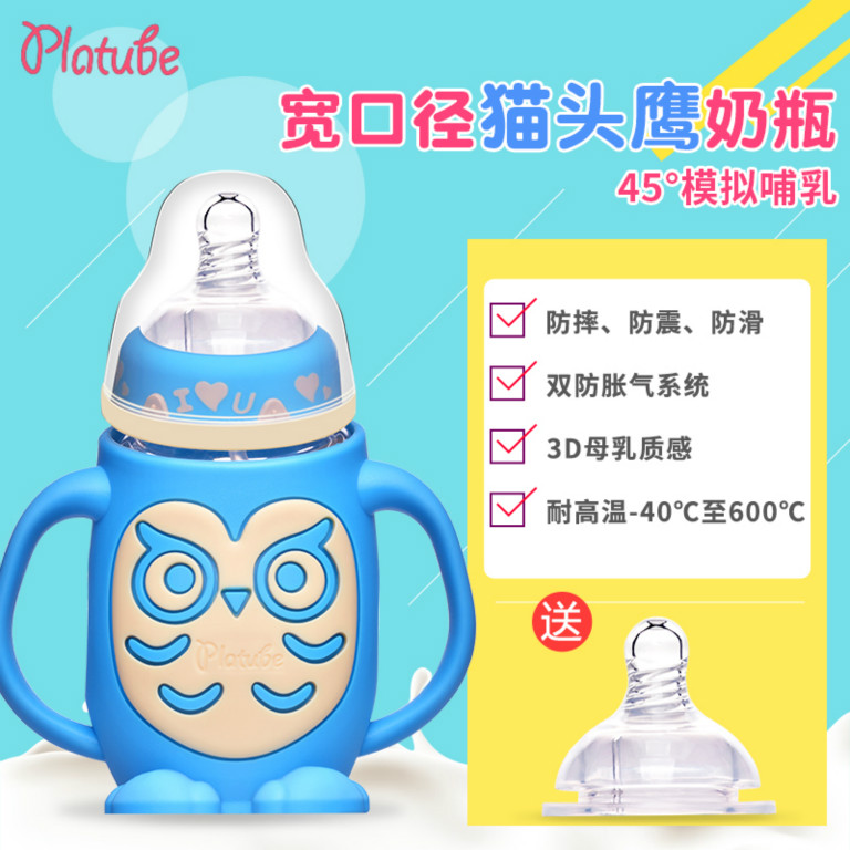 新生兒寬口徑玻璃奶瓶嬰兒帶手柄硅膠套動物奶瓶寶寶卡通型奶瓶
