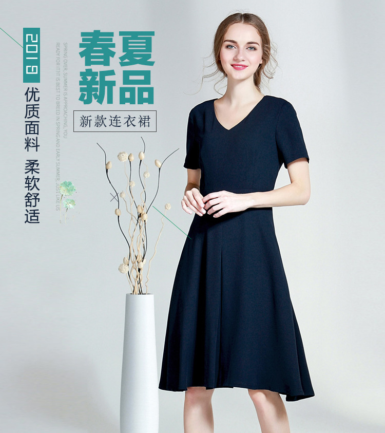 夏季新款短袖V領(lǐng)連衣裙女中長款高腰通勤大碼修身顯瘦氣質(zhì)OL女
