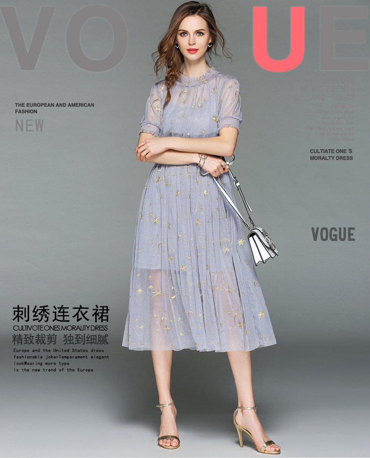 歐洲站夏季女裝 歐美新品時(shí)尚短袖網(wǎng)紗刺繡修身兩件套連衣裙